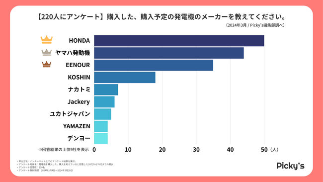 「Picky’s」は、インターネットショッピングにおいて、購入前に試せない・選ぶべきものがわからないという課題の解決を目標に、あらゆる商品のおすすめランキングや検証レビューを紹介するサイトです。このたびPicky’s(https://rentry.jp/)では、発電機についてインターネット上でアンケート調査を行いましたので発表いたします。