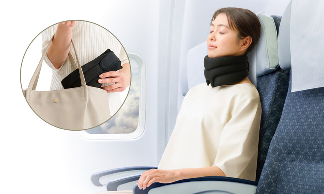 約50gと軽量、コンパクトなデザインなので、バッグに入れて携帯できます。ドライブや旅行、出張時にネックピローとしても活躍します。