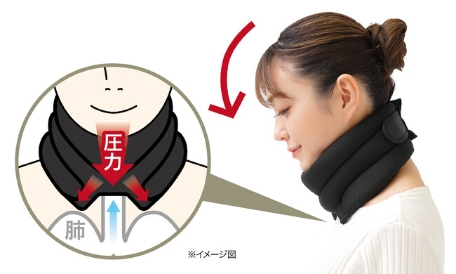 下段クッション部はくぼみがあることにより、頭を下げた時に左右に広がるので、気道を圧迫せず、呼吸しやすい設計となっています。これにより、快適な使用感を提供しながら、首をサポートします。