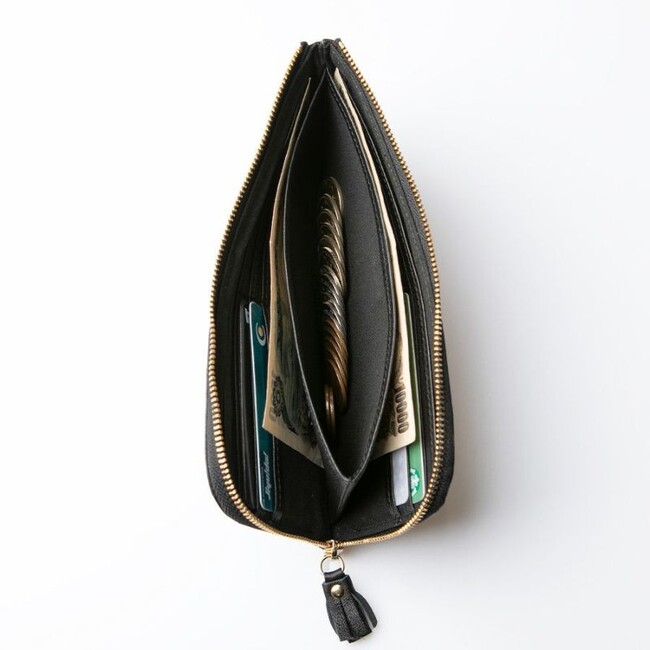 中身の出し入れがしやすい、ぐるっとL字に回るファスナー。