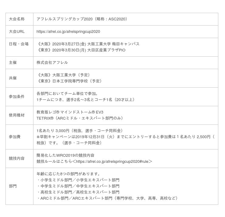 株式会社アフレル(所在地:福井県福井市、代表取締役社長:小林靖英)は、「アフレルスプリングカップ2020」を2020年3月27日(金)に大阪・3月30日(月)に東京で開催いたします。本大会は、選手2〜3名とコーチ1名で構成される1チームで出場し、小学生ミドル・エキスパート部門、中学生ミドル・エキスパート部門、高校生ミドル・エキスパート部門、ARCミドル・エキスパート部門の計8部門で競技を行います。全競技部門で400チームの参加を予定しており、大阪(大阪工業大学 梅田キャンパス)と東京(大田区産業プラザPiO)の二拠点で開催いたします。本日よりエントリー開始し、2019年12月31日(火)までにエントリーすると参加費が500円(税抜)お得な【早割キャンペーン】を実施します。また、「大会参加権」や「WRO ブロックセット」がついた特別セットの販売もスタートし、参加者を応援いたします。詳細やエントリーは大会公式WEBサイトをご確認ください。(https://afrel.co.jp/afrelspringcup2020)