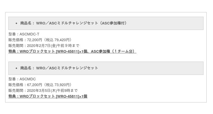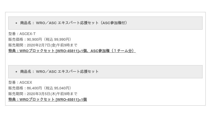期間限定で、はじめてWROやアフレルスプリングカップにチャレンジするチーム向けに、大会出場時に必要なものが揃ったセットに、ASC2020の参加権やWROブロックセットがついた特別セットを販売します。(https://afrel.co.jp/product/wro-set)