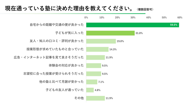 現在の塾に決めた決め手については、「自宅からの距離や交通の便が良かった」が最も高く59.5%という結果に。次点では「子どもが気に入った」が票を集めていることから、利便性と子どもの意見が最も決め手となる傾向にあるようです。その他の回答では「他の習い事と曜日を調整する必要があった」「子どもの学力に合っているレベルの塾を選んだ」等といった意見も。