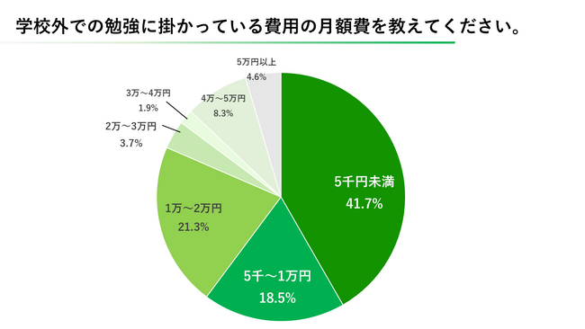 学校外での勉強に関しては「学習塾・公文」が最も多く4割弱が通っているという結果に。「参考書やワーク」による自主学習が2位、「学童」が3位の結果になりました。これらに関する月額費用は五千円未満が最も多く41.7%、次いで1万〜2万円が21.3%という結果になりました。