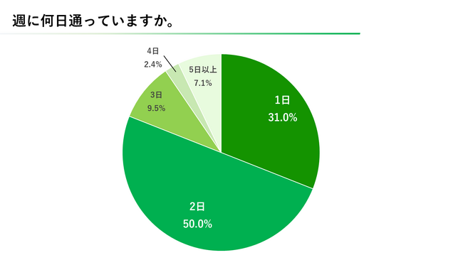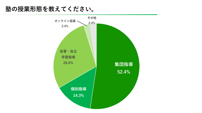塾に通う頻度に関する質問では「週に2日」という回答が最も多く全体の半数を占めました。週に1~2回の通塾が全体の8割程度を占めています。さらに塾の授業形態については、「集団指導」が最も多く52.4%となっています。次点で「自習・自立学習指導」が28.6%と、自習型の塾も人気が高いことが伺えます。「オンライン指導」は2.4%にとどまりました。