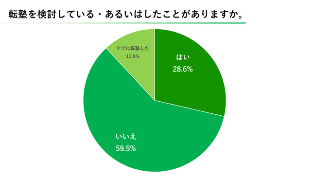 転塾を検討しているか否か、という質問では28.6%が「はい」と回答。また、およそ10人に1人がすでに転塾を経験しています。転塾の理由として最も多かったのは「受験に特化した塾に切り替えるため」であり、転塾を検討している方の23.5%は転塾の時期として「中学以降で考えている」と答えています。