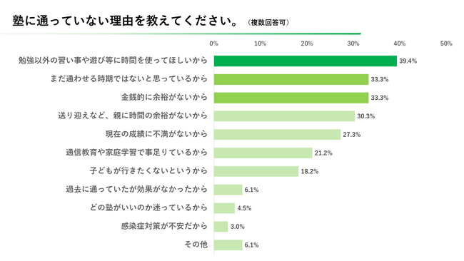 また、塾に通っていないと回答した方に「塾に通っていない理由」を調査したところ、下記のような結果に。「勉強以外の習い事や遊びに時間を使ってほしい」「まだ通わせる時期ではない」「金銭的に余裕がない」などに票が集まりました。