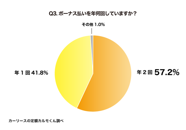 Q2でボーナス払いを行っていると回答した方に、年に何回ボーナス払いをしているか聞いたところ、最も多かったのは「年2回」で57.2%、続いて「年1回」が41.8%、「その他」が1.0%となっています。