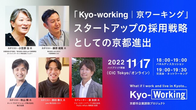 この度、第2回目として、投資家や起業家、実際に京都に拠点設置された企業、学生とスタートアップの接点創出や京町家での起業家コミュニティ運営を行っているキーマン等をお招きし、スタートアップが新卒・インターン生など、多様な人材の採用を行う上で京都市に拠点を置くメリットや、京都で暮らし・働くことの魅力を探索いただくトークイベントを下記のとおり開催しますので、お知らせします。