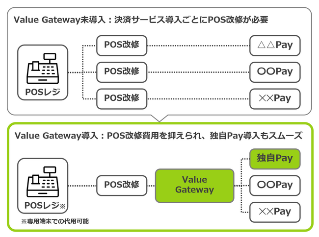 バリューデザインでは、飲食や小売など店舗ビジネスを展開する法人向けに、自店舗の顧客データを溜め、店舗の再来店を促進するキャッシュレス決済サービス「独自Pay」を軸とした複数のサービスを展開しており、現在、全国11万店舗以上に導入いただいています。なかでも「Value Gateway」は、複数の決済サービスに対応したい店舗に対し、一度のPOS改修で複数の決済手段への接続※を可能にするサービスです。店舗側の工数削減・コスト削減が見込めます。