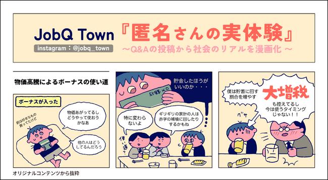 キャリアや就転職に特化した匿名相談サービス『JobQ Town(ジョブキュータウン)(※1)』(以下JobQ Town)を運営する株式会社ライボ(本社:東京都渋谷区 代表取締役:森 宏記 以下「ライボ」)は、JobQ Townで投稿される働く社会人のリアルな声を集め、現代の働き方や社会情勢を象徴するコンテンツとして3コマ漫画『匿名さんの実体験』をInstagramアカウントにて7月よりリニューアルしました。