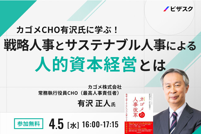「知見と、挑戦をつなぐ」をミッションにグローバルなナレッジプラットフォームを運営する株式会社ビザスク(以下、当社)は、「戦略人事とサステナブル人事による人的資本経営とは」をテーマに、「カゴメの人事改革: 戦略人事とサステナブル人事による人的資本経営」著者であり、カゴメ株式会社 常務執行役員CHO(最高人事責任者)の有沢正人氏 ご登壇による無料オンラインセミナーを、4/5(水)16時より開催します。