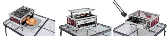 炭の熱を有効活用した、簡易オーブン機能付きのテーブルトップグリル。上のグリルでBBQをしながら、下のオーブンでトーストや冷凍ピザを簡易的に焼き上げるなど、省スペースで手軽に同時調理ができます。さらに、従来のクールスパイダープロシリーズ同様に焼き網の高さを変更して火力をコントロールすることが可能、かつ、調理の途中でも炭の継ぎ足しが簡単に行える引き出し式のロストルで常に最適な火加減を保つことができるのも大きな特長。アウトドアシーンでの持ち運びに便利な専用ケースが付属します。