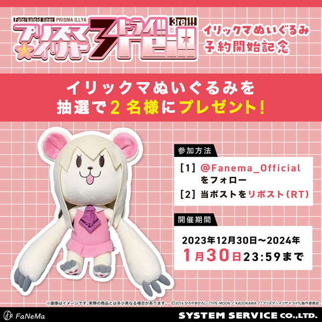 システムサービス株式会社(本社:東京都豊島区、代表取締役社長:田村宗弘)は、アニメ・マンガ・ゲーム作品等のキャラクター商品の企画・製作・販売をする自社ECサイト「FaNeMa」(URL:https://fanema.jp/)にて、TVアニメ『Fate/kaleid liner プリズマ☆イリヤ ドライ!!』より「ぬいぐるみ イリックマ」を発売いたします。
