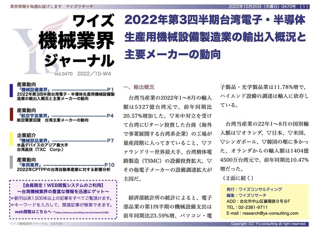 ワイズコンサルティング グループ(本社:中華民国台北市、代表取締役:吉本康志)は台湾機械業界専門誌「ワイズ機械業界ジャーナル」の2022年10月第4週号を発行しました。今週号では、機械設備業界、航空宇宙業界、水晶デバイスのアジア最大手の台湾晶技と車両業界の動向を紹介します。