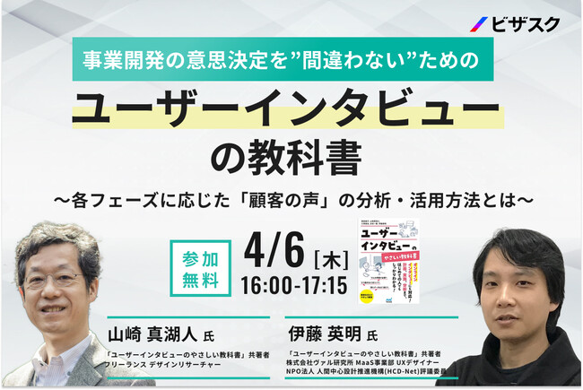 「知見と、挑戦をつなぐ」をミッションにグローバルなナレッジプラットフォームを運営する株式会社ビザスク(以下、当社)は、「各フェーズに応じた『顧客の声』の分析・活用方法とは」をテーマに、「ユーザーインタビューのやさしい教科書」共著者である、山崎 真湖人氏と伊藤 英明氏のご登壇による無料オンラインセミナーを、4/6(木)16時より開催します。