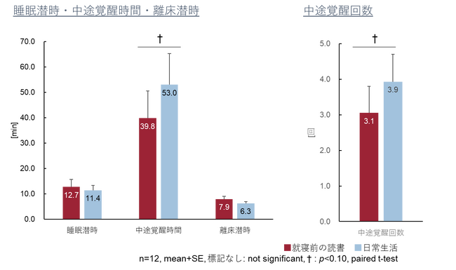 睡眠に課題を感じている方の中で、睡眠前に読書を行う群は、日常生活を行う群と比較して、中途覚醒時間・回数*4が減少する傾向が確認されました。