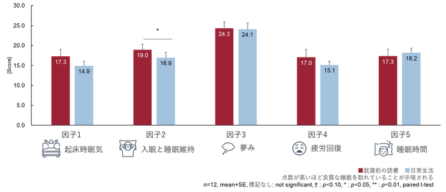 起床時の自身の睡眠を評価する心理尺度であるOSA睡眠調査票を用いたアンケート評価で、睡眠に関する主観的評価を比較しました。以下の5つの睡眠因子のうち、「2.入眠と睡眠維持」において、「就寝前の読書」を行う群が「日常生活」を行う群と比較して、有意に点数が高いことが確認されました。