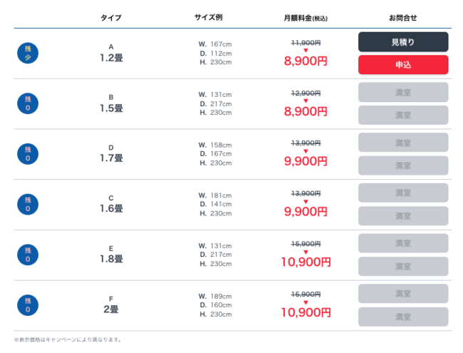 部屋タイプとサイズ、月額料金はこちら