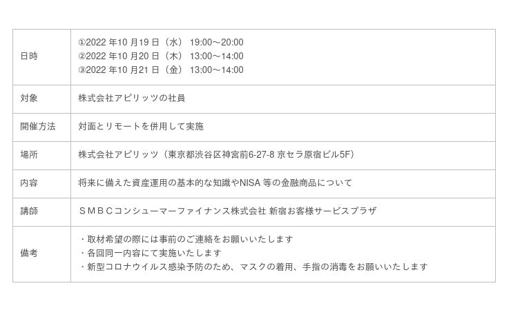 アピリッツ、取引銀行である三井住友銀行グループのSMBCコンシューマーファイナンス株式会社と協働し従業員に対して金融経済教育セミナーを提供