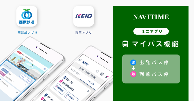 この度鉄道事業者から、駅から自宅や会社/学校などまでのラストワンマイルを支える二次交通に対する機能拡充のご要望を受け、2022年2月28日(月)から西武鉄道株式会社(代表取締役社長:喜多村 樹美男、本社:埼玉県所沢市)の『西武線アプリ』にて利用を開始し、「マイルート」としてよく利用するバスのルートを登録してワンタップで運行情報を確認できるようになりました。更に本日から京王電鉄株式会社(代表取締役社長:紅村 康、本社:東京都多摩市)が提供する『京王アプリ』のリニューアルに合わせて提供を開始し、トップ画面にて「マイバス」機能をご利用いただけます。