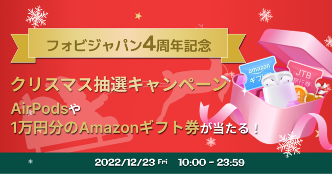 フォビジャパン株式会社(所在地:東京都港区、代表取締役社長:関 磊、以下「フォビジャパン」)は、AirPodsや1万円分のAmazonギフト券などが当たるフォビジャパン4周年記念・クリスマス抽選キャンペーンを12月23日(金)10:00より実施いたします。ハズレなし!販売所約定金額に応じて抽選に参加できます!