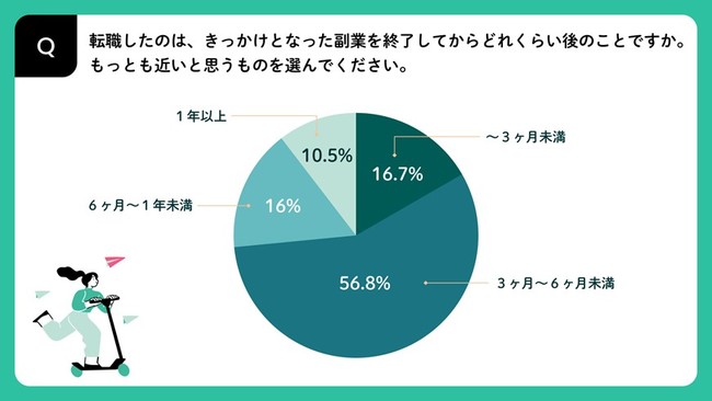 「転職したのは、きっかけとなった副業を終了してからどれくらい後のことですか。」と尋ねたところ、3か月未満は16.7%、3か月〜6か月未満は56.8%、6か月〜1年未満は16%、1年以上は10.5%となりました。3か月〜6か月未満が最も多いことから副業が終了してすぐではなく、数か月、今の会社との比較や自身のキャリアについて考えてから転職を決める方が多いことが伺えます。