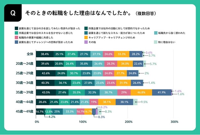年齢別で転職理由を見てみると、20歳〜24歳、25歳〜29歳、30歳〜34歳においては「副業を通じて自分の力を試したい気持ちが強まった」が最も多い理由となりました。35歳〜39歳では「キャリアアップ・キャリアチェンジのため」で46.8%となりました。40歳〜44歳では「キャリアアップ・キャリアチェンジのため」、「副業を通じてチャレンジへの恐怖が弱まったため」がならび38.1%でした。45歳〜49歳は「転職先から強く誘われた」が最も多く33.3%となりました。