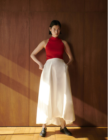 Halter neck knit (red) ¥7,700 / Balloon volume skirt (white) ¥14,300