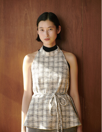Halter neck knit (black) ¥7,700 / Back open apron top (white)¥12,100