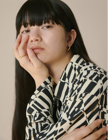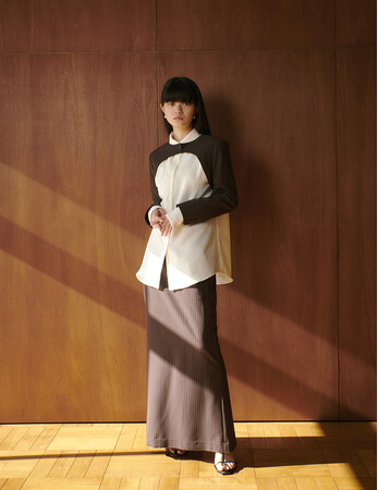 Stripe sleeve jacket (brown) ¥17,600 / Flower jacquard shirt (white) ¥19,800 / Stripe slit long skirt (brown) ¥15,400