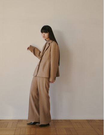 Tweed peplum jacket (brown) ¥35,200 / Tweed center press pants (brown) ¥20,900