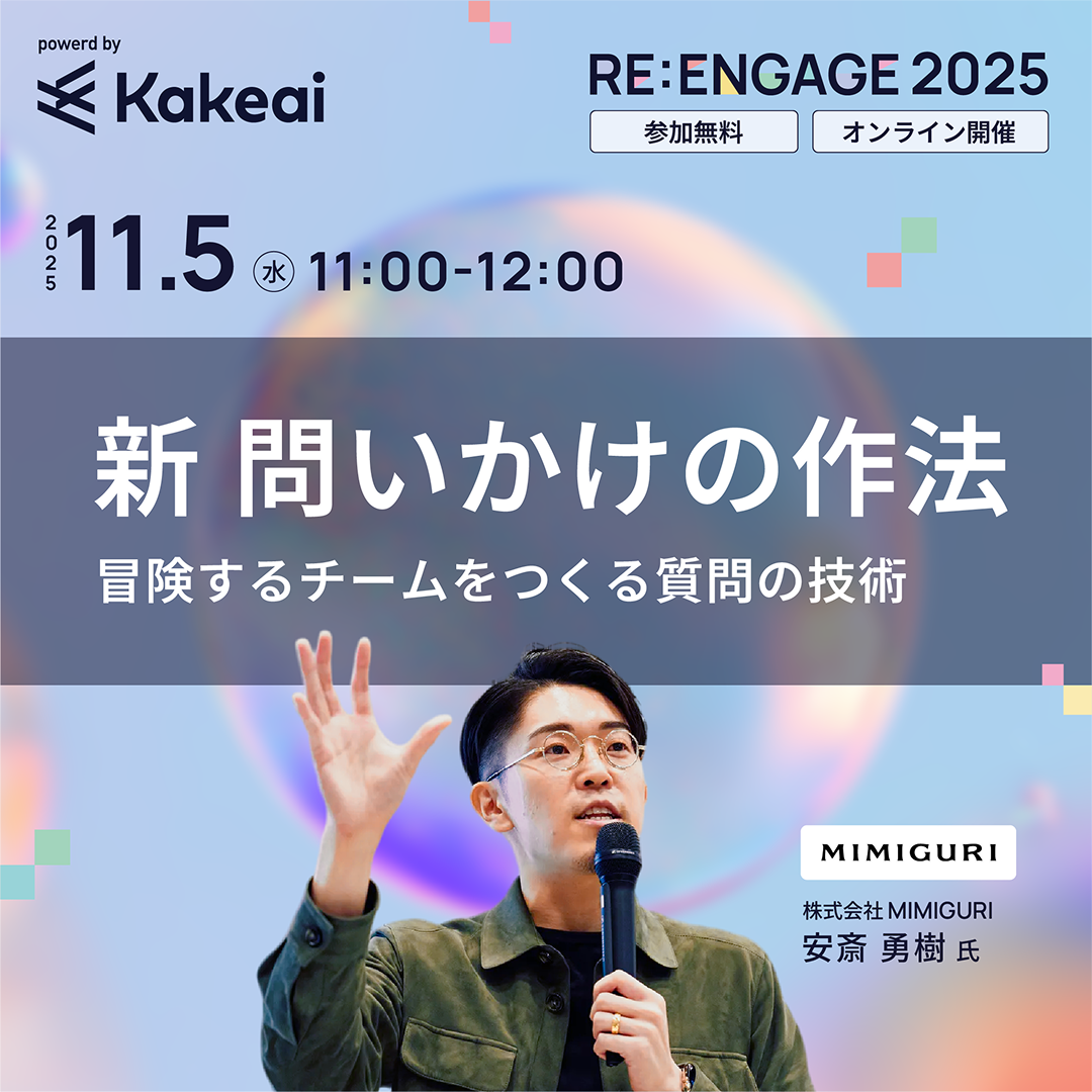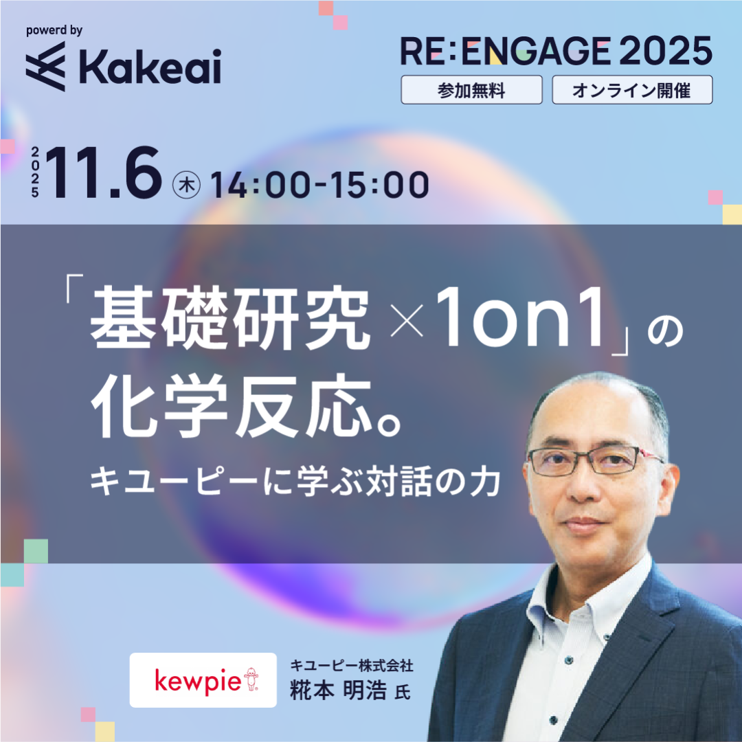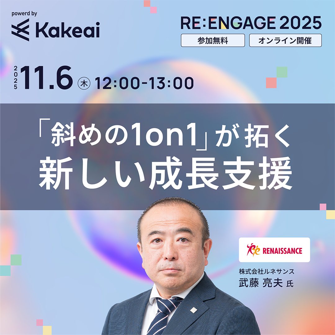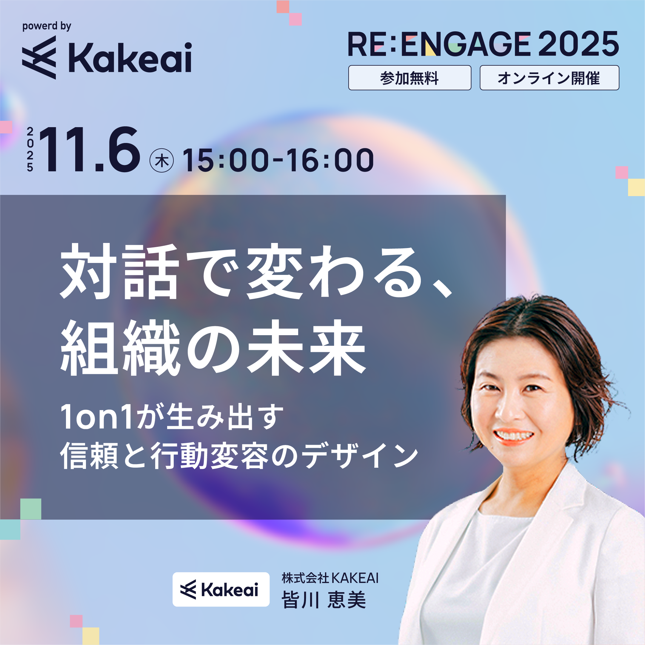 1on1ミーティングをはじめとする面談サポートシステム「Kakeai(カケアイ)」を開発・運営する株式会社KAKEAI(本社:東京都渋谷区 代表取締役社長 皆川恵美、以下KAKEAI)は、2025年11月4日(火)、5日(水)、6日(木)にカンファレンス「RE:ENGAGE 2025|1on1の進化が現場の行動と組織の成果を変えていく」を開催いたします。1on1の最新理論や実践事例を通じて、組織の成長と変革を推進するリアルなヒントとネットワークを得られる機会を提供します!