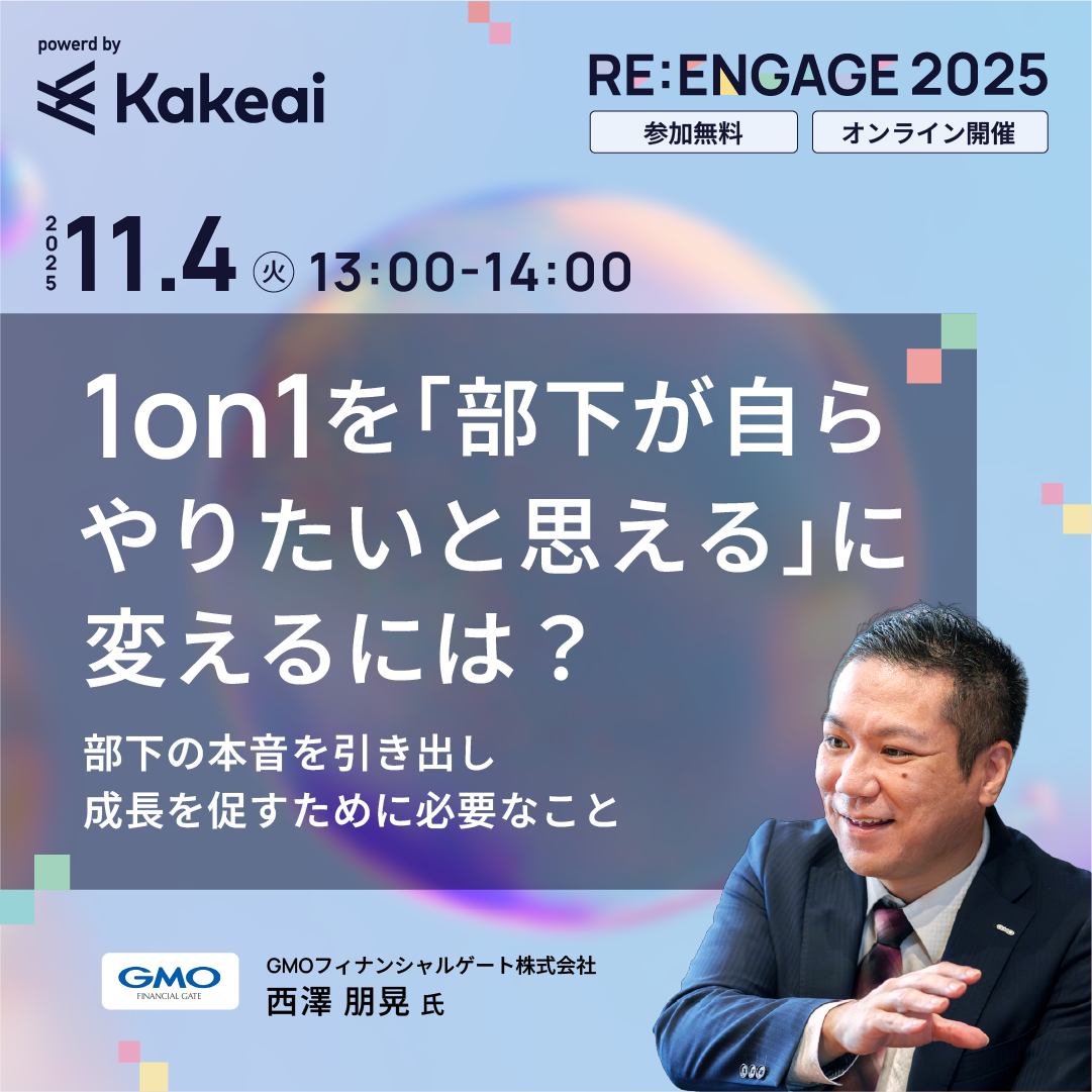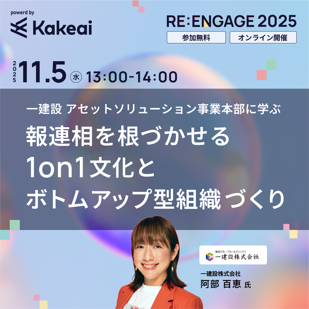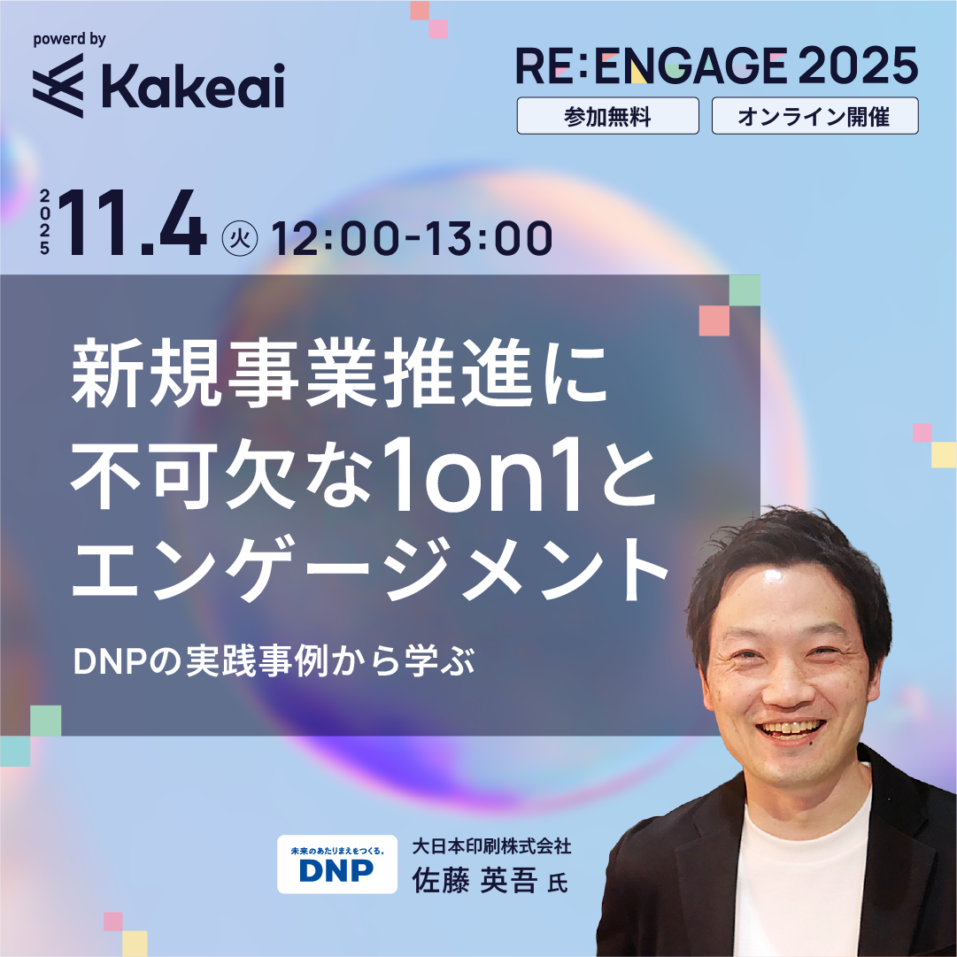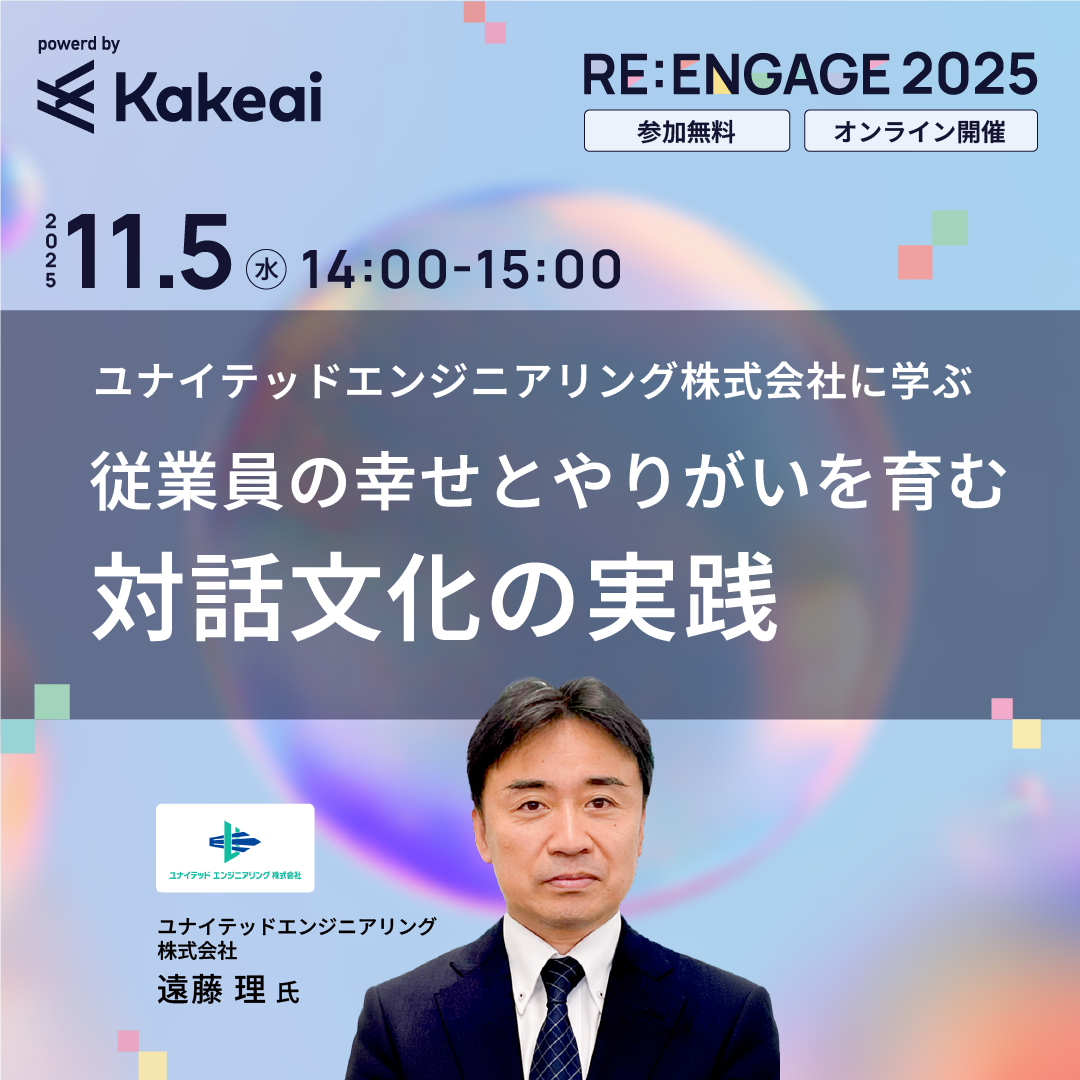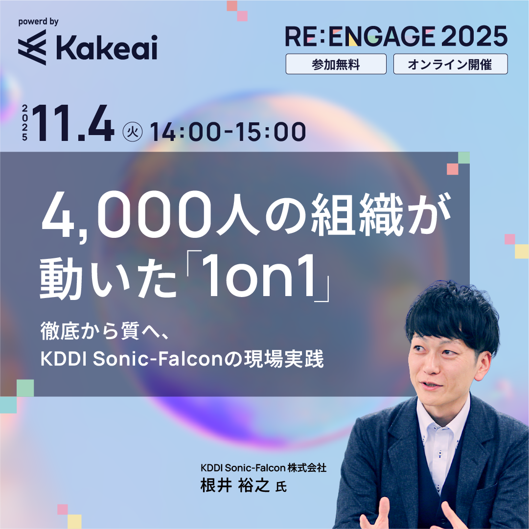 1on1ミーティングをはじめとする面談サポートシステム「Kakeai(カケアイ)」を開発・運営する株式会社KAKEAI(本社:東京都渋谷区 代表取締役社長 皆川恵美、以下KAKEAI)は、2025年11月4日(火)、5日(水)、6日(木)にカンファレンス「RE:ENGAGE 2025|1on1の進化が現場の行動と組織の成果を変えていく」を開催いたします。1on1の最新理論や実践事例を通じて、組織の成長と変革を推進するリアルなヒントとネットワークを得られる機会を提供します!