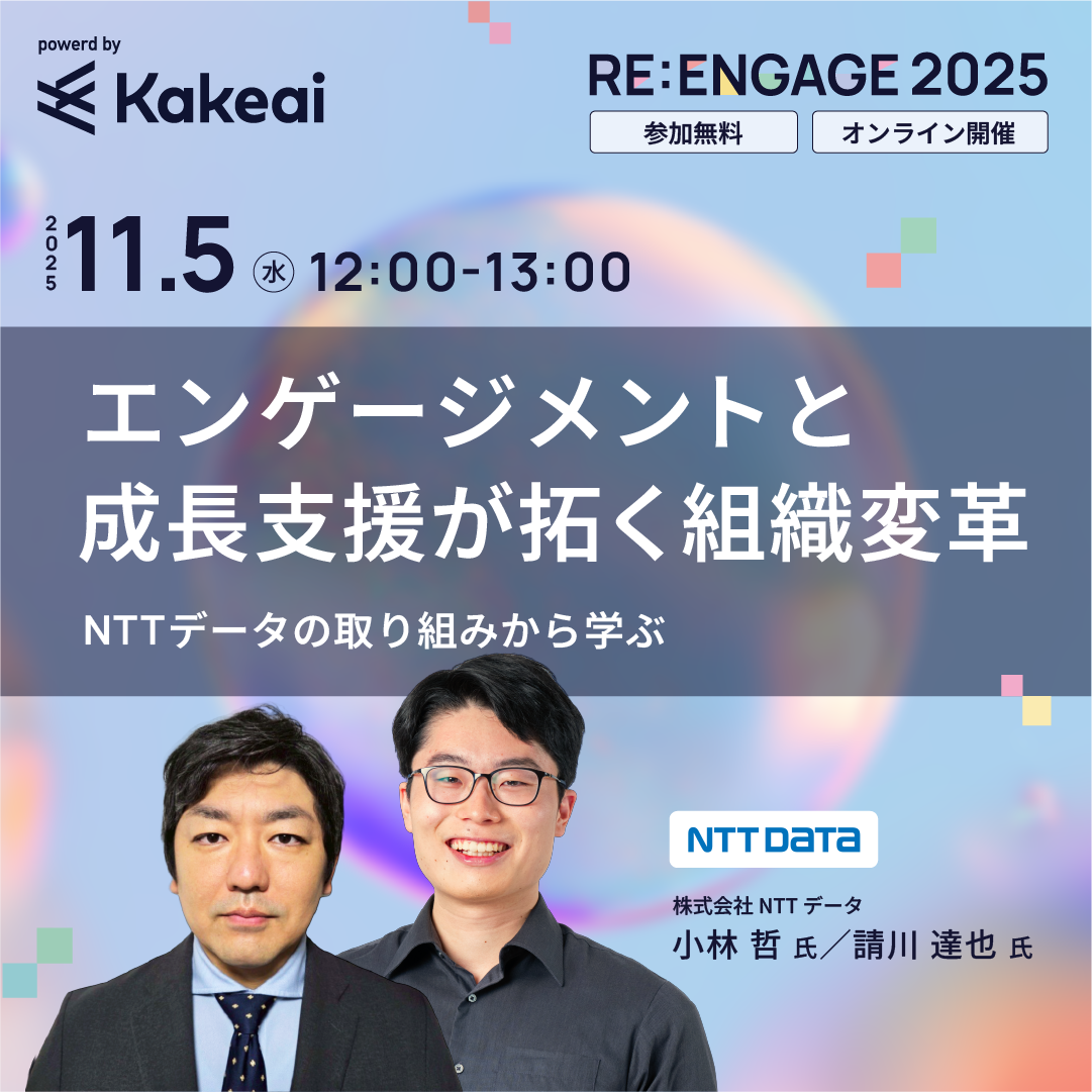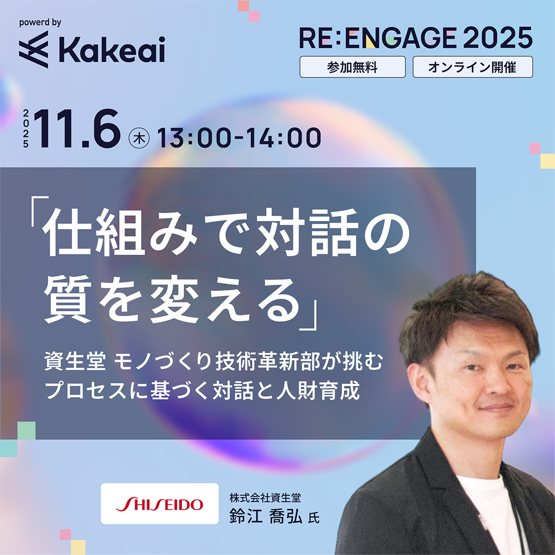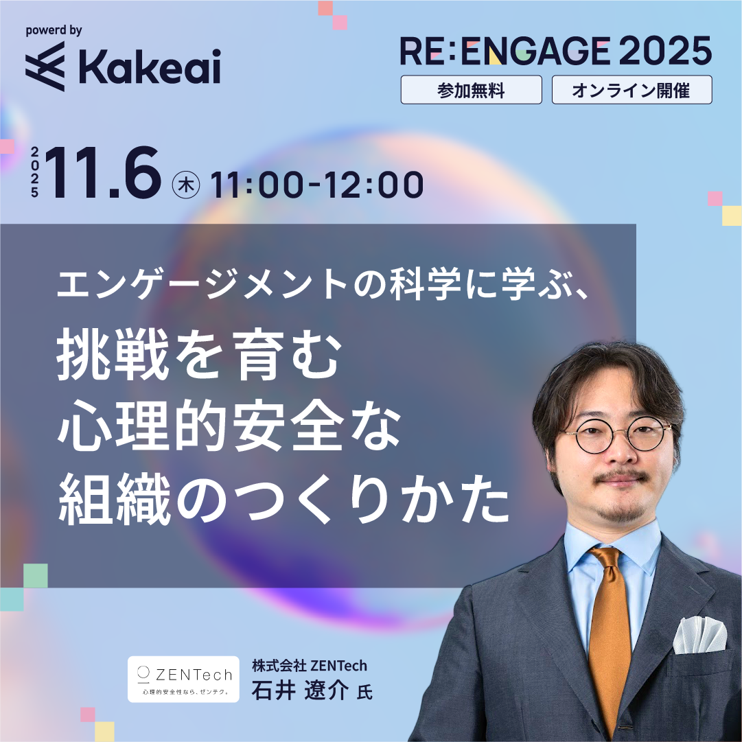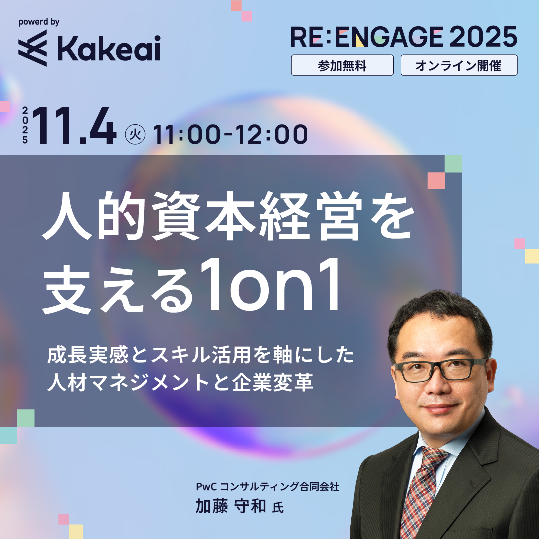 1on1ミーティングをはじめとする面談サポートシステム「Kakeai(カケアイ)」を開発・運営する株式会社KAKEAI(本社:東京都渋谷区 代表取締役社長 皆川恵美、以下KAKEAI)は、2025年11月4日(火)、5日(水)、6日(木)にカンファレンス「RE:ENGAGE 2025|1on1の進化が現場の行動と組織の成果を変えていく」を開催いたします。1on1の最新理論や実践事例を通じて、組織の成長と変革を推進するリアルなヒントとネットワークを得られる機会を提供します!