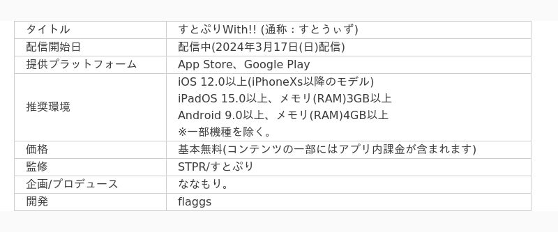 株式会社STPR(本社:東京都渋谷区、代表取締役:柏原 真人、以下STPR)と株式会社flaggs(フラッグス)(本社:東京都品川区、代表取締役CEO:吉江 直人)は、本日7月31日(水)に2.5次元アイドルグループ「すとぷり」の公式ゲームアプリ「すとぷりWith!!(通称:すとうぃず)」のゲーム内イベント「夏だ!花火だ!すとぷりと謎の少女の秘密 前編」の開催についてお知らせいたします。