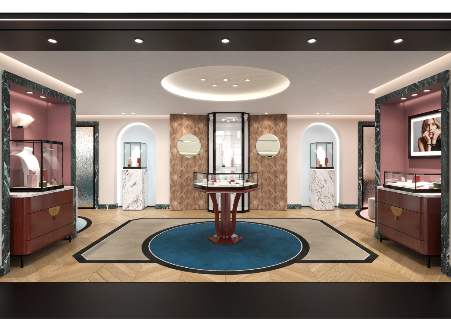 1893年、創業者のフレデリック・ブシュロンはヴァンドーム広場で、ハイジュエラーとして初めてブティックを構えました。ブシュロン 西武池袋店は、世界中のブシュロンのブティックと同様、パリ・ヴァンドーム広場26番地にあるメゾンの歴史的本店の建築様式からインスピレーションを得ています。ブティックのファサードは、アイコニックなブシュロン グリーンのメタルプリズムで構成され、幻想的なミラー効果を生み出しています。インテリアには、グリーンの大理石のモールディングフレーム、ブラックメタルのアクセント、アールデコに着想を得たシンメトリーのデザインが取り入れられ、ブシュロンならではの美学を表現しています。