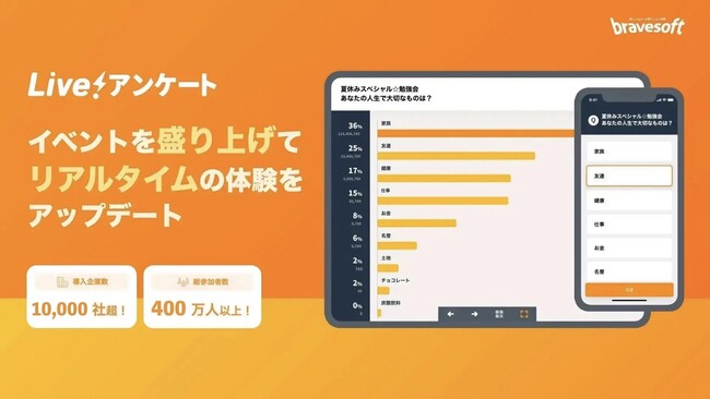 “イベンテックNo.1企業”を目指し、イベントをテクノロジーの力で盛り上げていくことを目指すbravesoft株式会社(本社:東京都港区、代表取締役:菅澤英司、https://www.bravesoft.co.jp/)が提供する自社プロダクト「Live!アンケート(https://enquete.eventos.tokyo/)」がこの度、サービス開始以降から計測していた「累計導入企業」が10,000社を達成したことを発表いたします。
