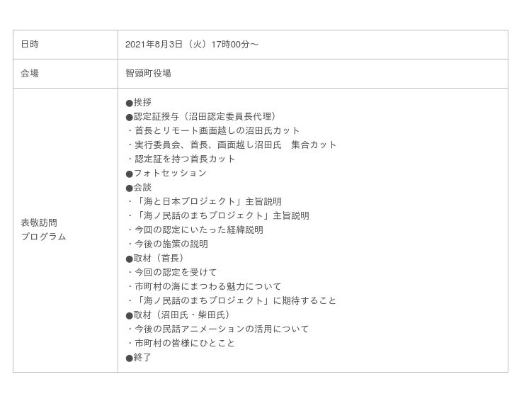 日本中に残された海にまつわる民話を発掘し、その民話のストーリーと、そこに込められた「想い」「警鐘」「教訓」を、親しみやすいアニメーションとして映像化します。当日は、認定委員長をはじめとする事務局メンバーが「海ノ民話のまち」として認定した10つのエリアのうちの1つである鳥取県智頭町の金兒英夫町長を表敬訪問し、「海ノ民話のまち」認定証贈呈式を行いました。