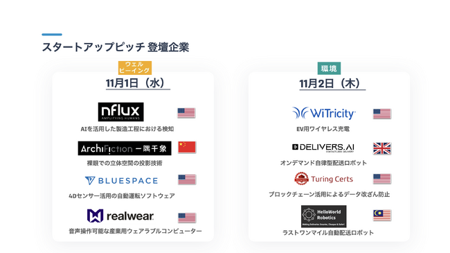※スタートアップ各社の出展日程については上記の添付図よりご確認ください。なお、当日の登壇企業・スケジュールについて、予告なく変更となる場合がございます。予めご了承の程お願い申し上げます。