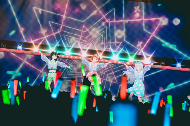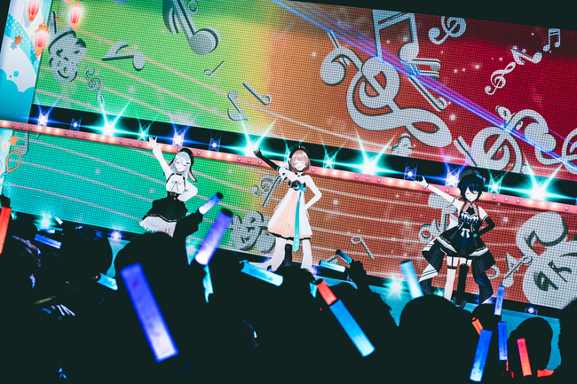 最初のMCであおぎり高校の音霊魂子、栗駒こまる、山黒音玄の3人が登場。「あおぎり高校ー!」と雄叫びや、コールアンドレスポンスに加え、軽快なトークで会場を盛り上げた。そのまま3人で『ハッピーシンセサイザ』を披露し、トークで盛り上げながらライブパートでしっかりと見せてくるパフォーマンス力は圧巻だった。音符が飛び交う映像演出と、3人らしい元気いっぱいのライブを見せてくれた。