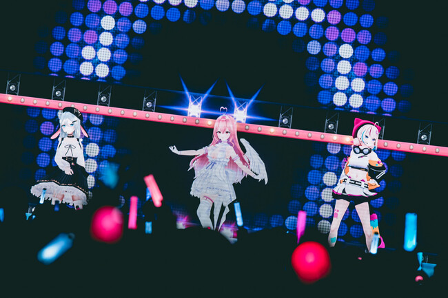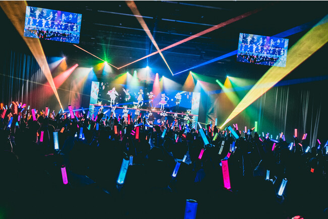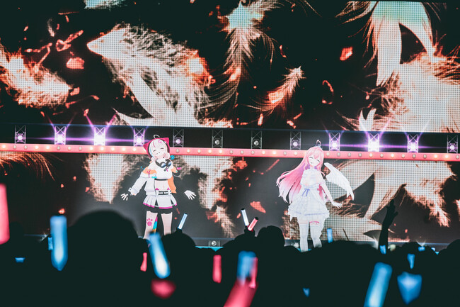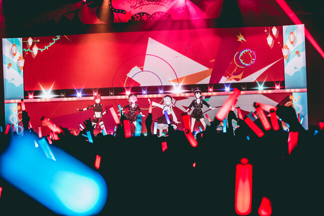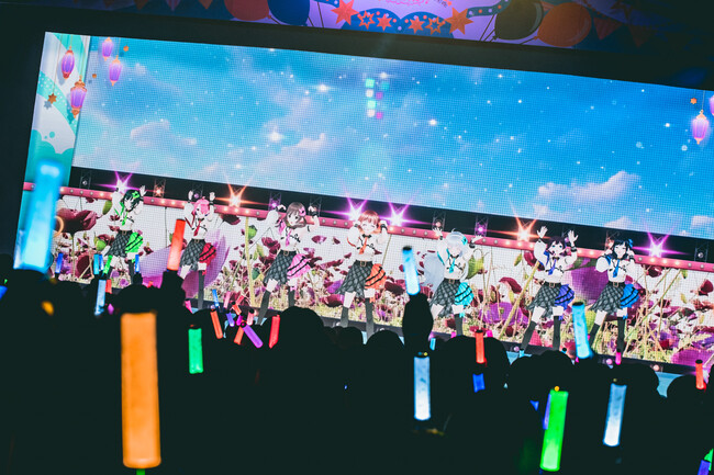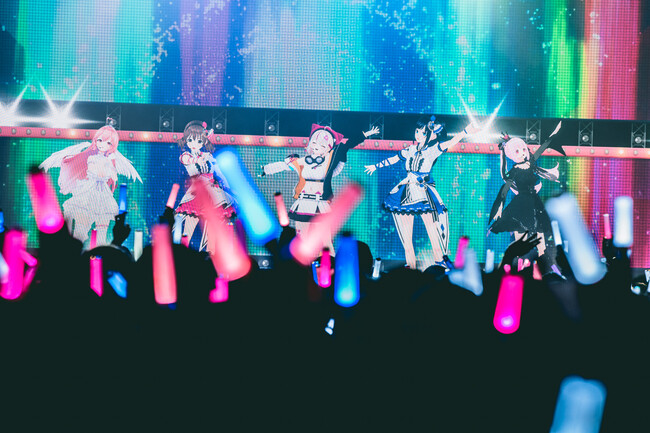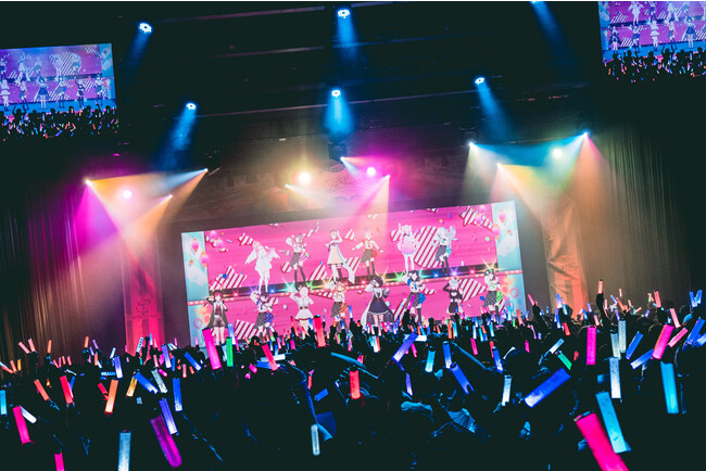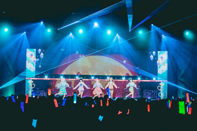 開幕を飾ったのは、2020年リリースされたバーチャルアーティストのコンピアルバム『VirtuaREAL.02』収録曲である『トリコロール・ステップ』が披露された。1番手を担ったあおぎり高校7名が鮮やかに、そしてパワフルで熱気溢れるパフォーマンスを展開し、最高の滑り出しを飾った。眩いカラフルなレーザービームが目まぐるしく動き回り、会場全体を彩っていく。息の合ったパフォーマンスと鮮やかなステージ演出に対し、オーディエンスもカラフルなペンライトで応戦。可憐に動き回るあおぎり高校のメンバーに届くように、興奮が伝わるほどの応援する姿が印象深かった。心地よい緊張感も漂いつつ、1曲目からこの日のライブの期待値は跳ね上がった。