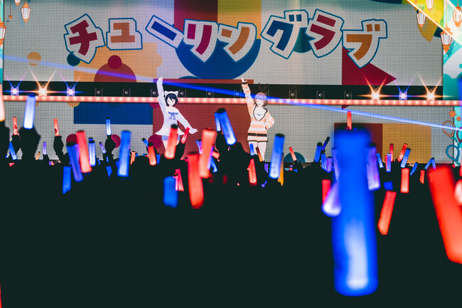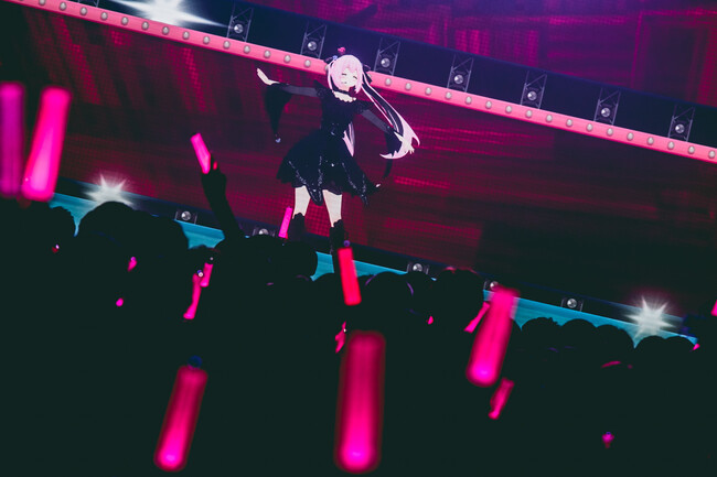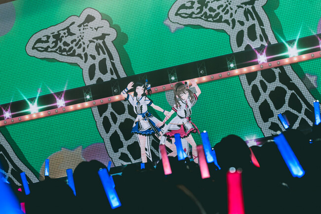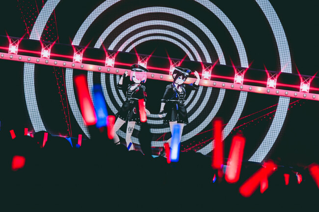 会場が暗転したあと、披露されたのは音霊魂子と栗駒こまるによる『チューリングラブ』。衣装チェンジした2人がゆるい雰囲気を醸しながらも、振り付けから歌までしっかりとパフォーマンスを行う。ギャップやパフォーマンス力も相乗して、オーディエンスはとにかく沸き上がった。格好良さが強調されたライブと、『チューリングラブ』のような可愛さ全開のライブが続き、バラエティ豊かなライブ構成が終盤まで続いていく。