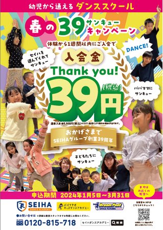 【セイハダンスアカデミー】では、2024年1月5日〜3月31日まで、ご入会いただくお客様に感謝の気持ちを込めて「春の39キャンペーン」を実施しております。