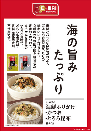 株式会社平和堂(滋賀県彦根市、代表取締役社長執行役員:平松正嗣)は、平和堂こだわりブランドE-WA!の新商品として、「E-WA! 海鮮ふりかけ かつお」と「E-WA! 海鮮ふりかけ とろろ昆布」を、4月21日(金)より平和堂・エールの158店舗で発売しました。