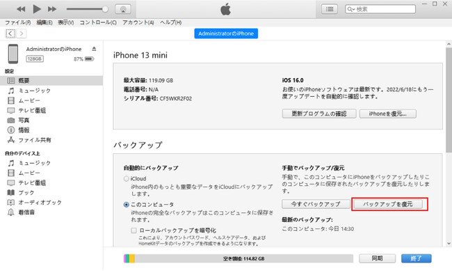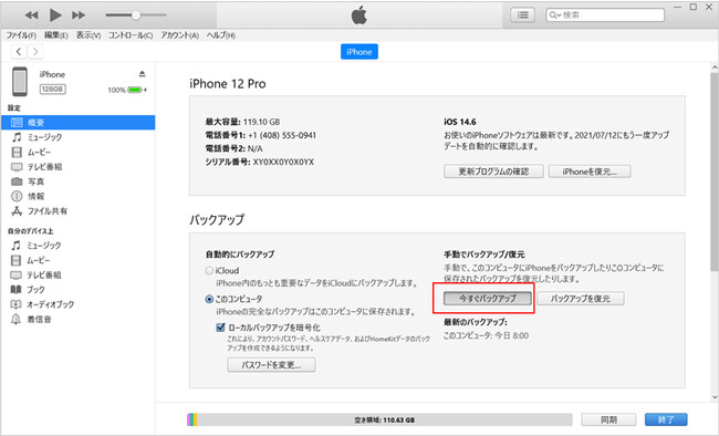 方法2:使っているiPhoneと接続してiTunesでデータをバックアップ