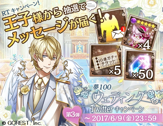 株式会社ジークレスト(本社:東京都渋谷区、代表取締役社長:末光晴人)が提供する、女性向けスマホパズルRPG「夢王国と眠れる100人の王子様」(以下、「夢100」)は、2017年5月29日(月)より「ウェディングTwitterキャンペーン」を実施いたします。