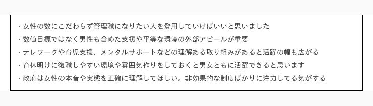 女性の働き方に関して政府や企業に対して理解を求めるコメントが顕著でした。