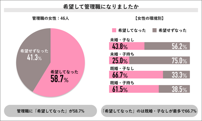 現在管理職の女性46人に、希望して管理職に就いたかを聞くと、「希望してなった」が58.7%、「希望せずなった」が41.3%と、”希望した”が過半数を占める結果となりました。同質問の婚姻状態及び子供の有無別の回答では、「既婚・子なし女性」が66.7%と最多になり、次いで「既婚・子持ち」が61.5%と、既婚女性ほど希望して管理職なった割合が高い結果になりました。