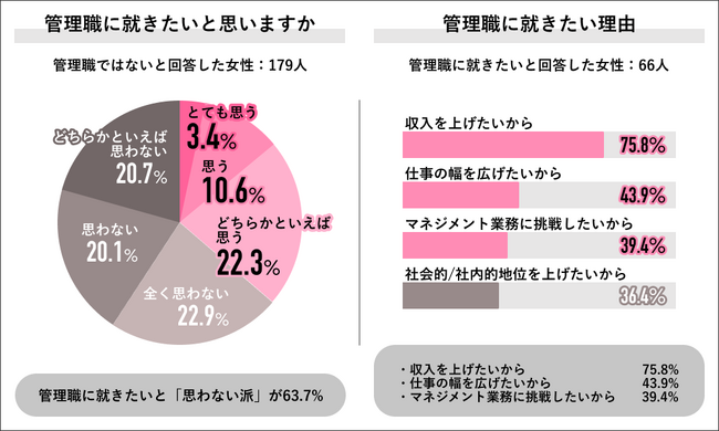 管理職を希望すると回答した66人にその理由を聞くと、「収入をあげたいから」が75.8%で最多回答になり、次いで「仕事の幅を広げたいから」が43.9%、「マネジメント業務に挑戦したいから」が39.4%で上位3つの回答となりました。
